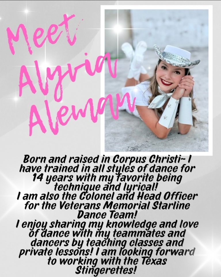 - Texas Stingerettes: Official practice attire, hair in bun, tan insteps.